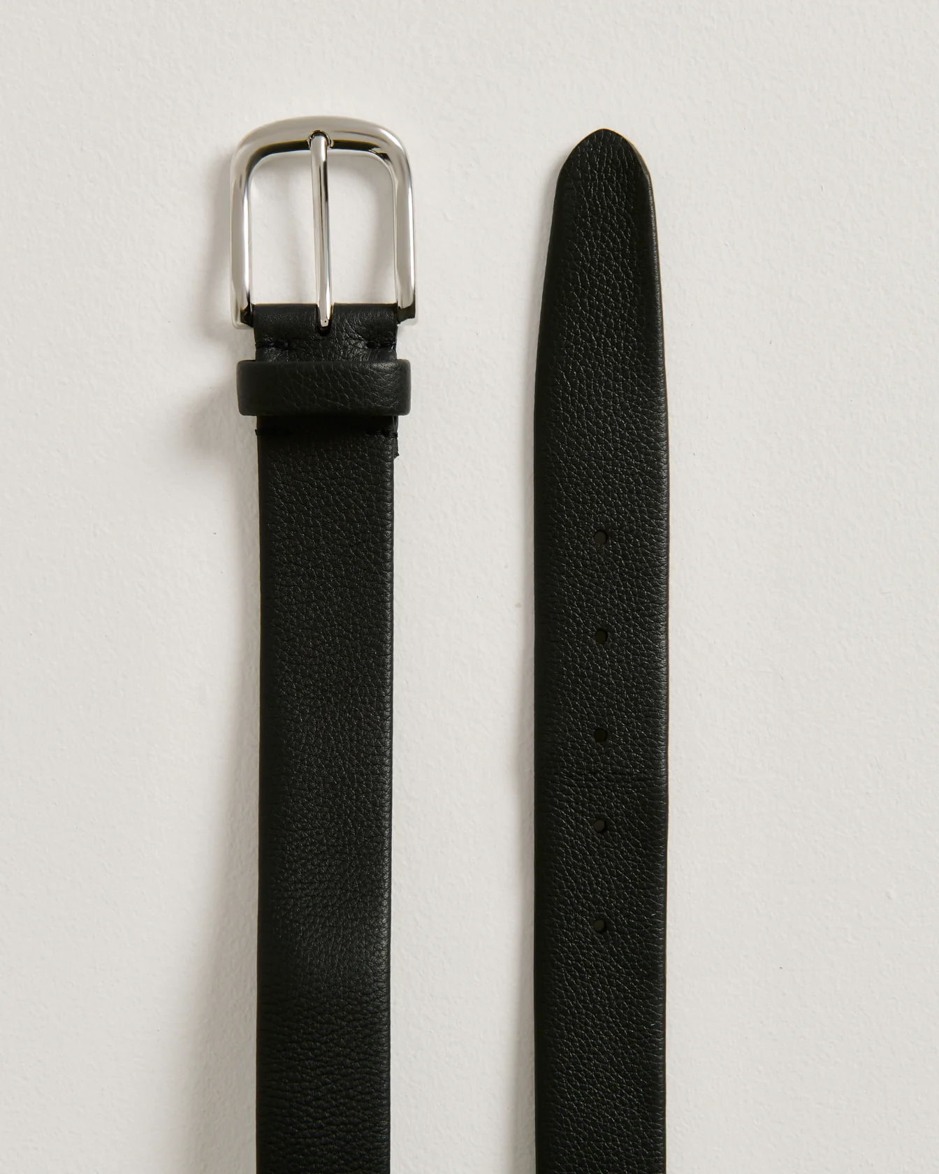 Calfskin features a natural grain and a compact handle. The polished metal buckle defines a clean, orderly accent. The clean line makes it easy to pair with both everyday and formal looks. A carefully finished accessory designed to complete the wardrobe with understatement.