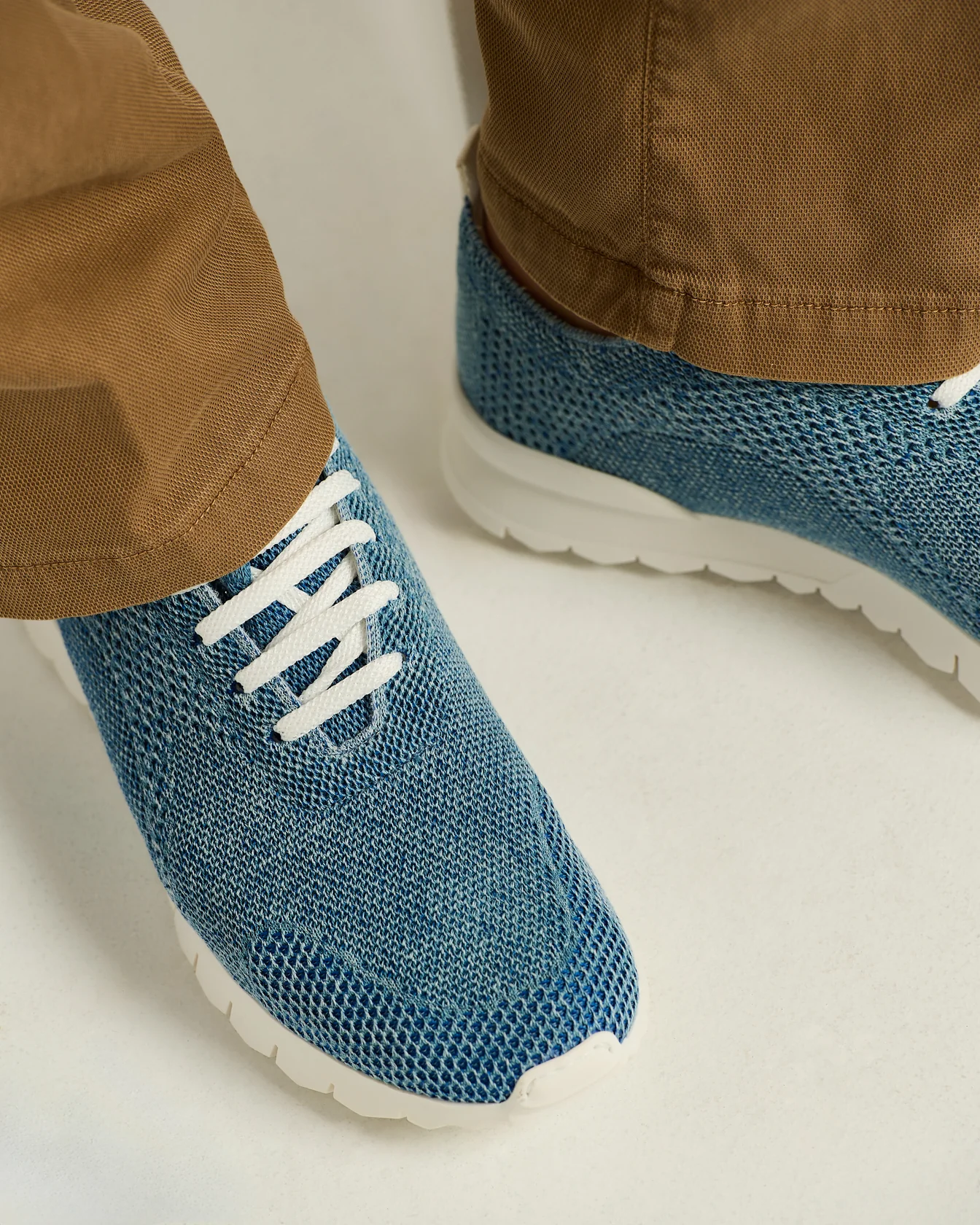 Footwear crafted from cotton knit and constructed in a single piece to ensure lightness and continuity. The upper is defined by an interplay of different stitches that enhances the design of the knit. The light-coloured sole, flexible and extra-lightweight, ensures natural support. The elasticated tongue facilitates ease of wear, while mesh laces with a red tip are reminiscent of the maisonÂ’s signature style. The embroidered logo adds a distinctive detail. All Kiton sneakers are made at our Naples workshop, where aesthetics and technique come together in respect of handcrafted tradition.