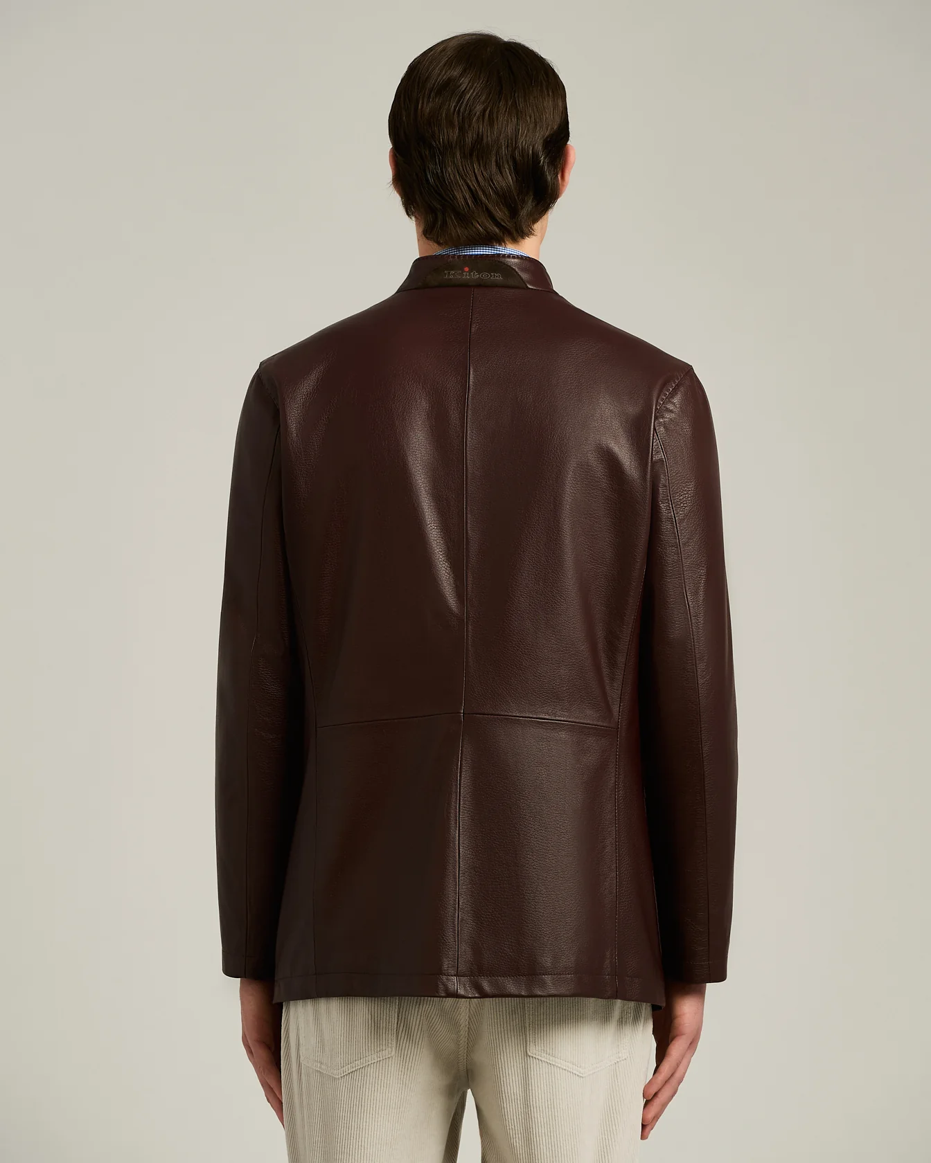 Formal purity meets the softness of lambskin in this jacket defined by sleek, impeccable style. The silhouette is slim and sharp, highlighting the tactile quality of the leather, selected from the finest natural nappa. The sophisticated, modern mandarin collar gives the garment distinctive character, designed for the man who values elegance without compromising practicality. Large patch pockets and button fastening contribute to a discreet yet confident aesthetic. Every detail is hand-finished in the Collecchio workshop, a perfect fusion of craftsmanship and innovation.